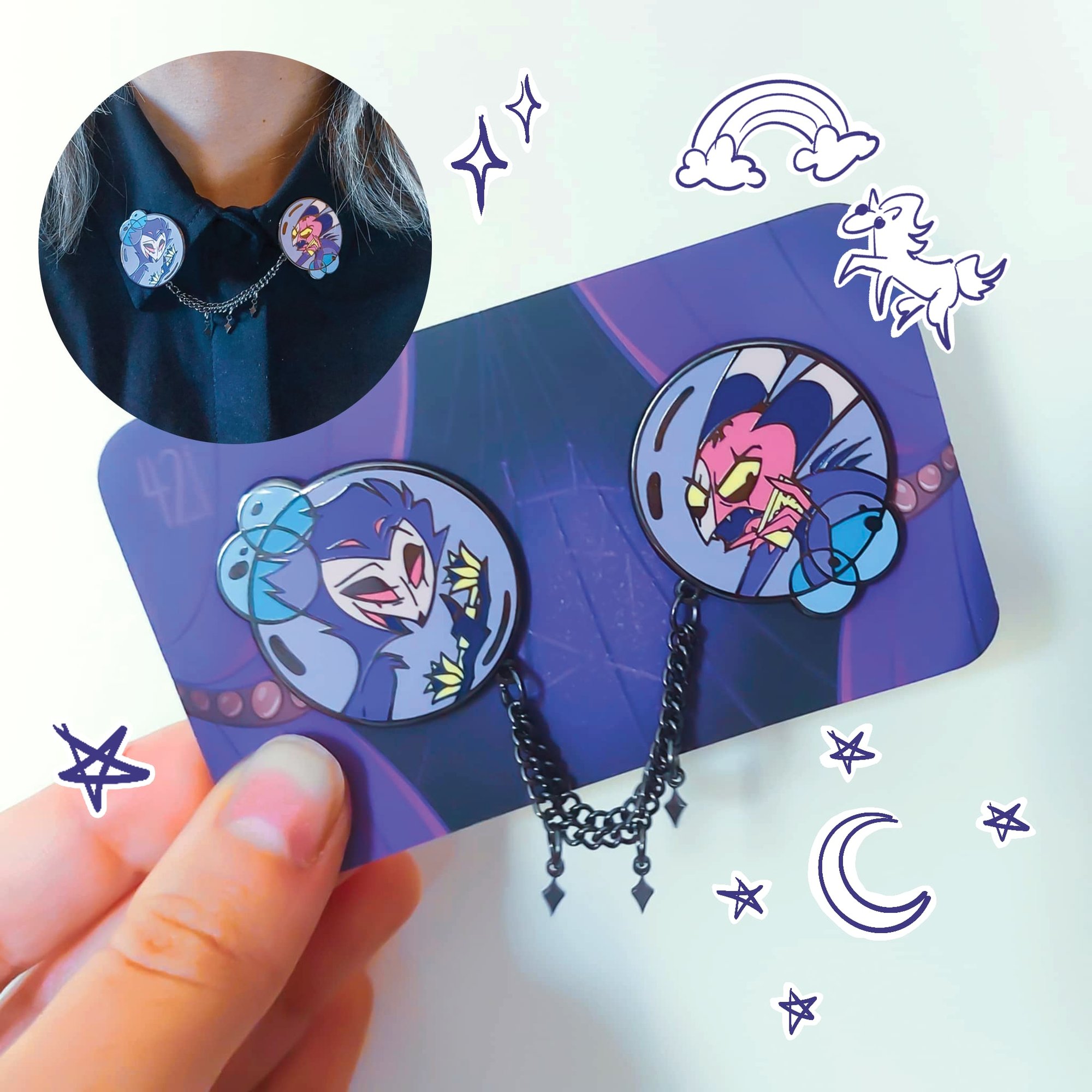 Chain-linked dual enamel pins, 3cm diameter, nickel plated finish.